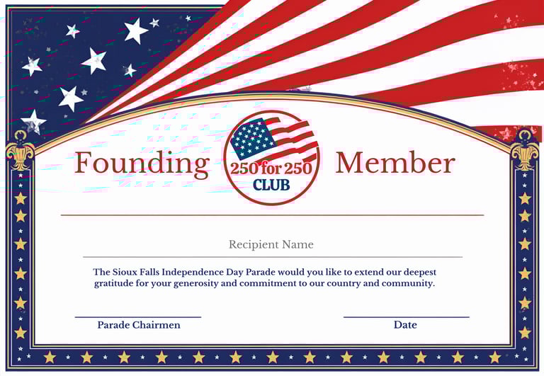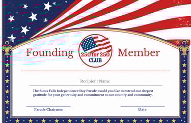 To help ensure the financial future of the Sioux Falls Independence Day Parade for years to come, we are launching the "250 for 250 Club": an exclusive group of 250 founding members supporting the parade.